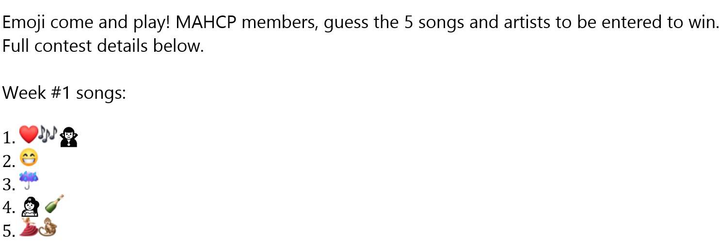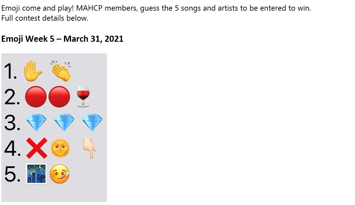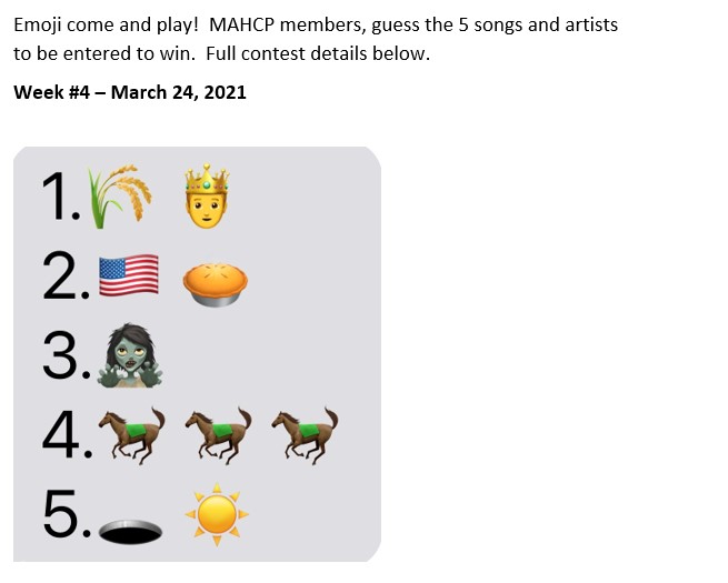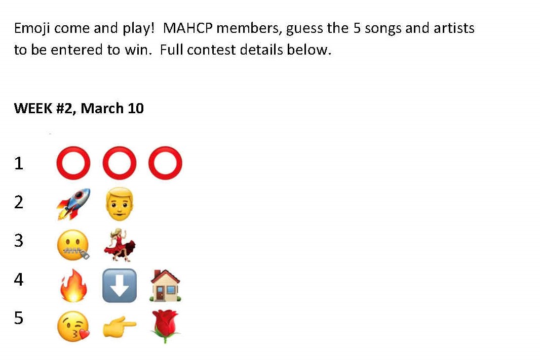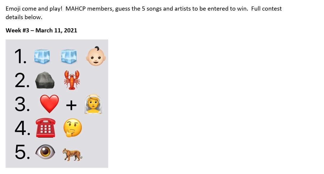 MAHCP’s Member Engagement Committee wants to beat the Mid-week Blues away with a fun contest. For the month of March every Wednesday we will be posting on Facebook and www.MAHCP.ca 5 songs titles using Emojis.