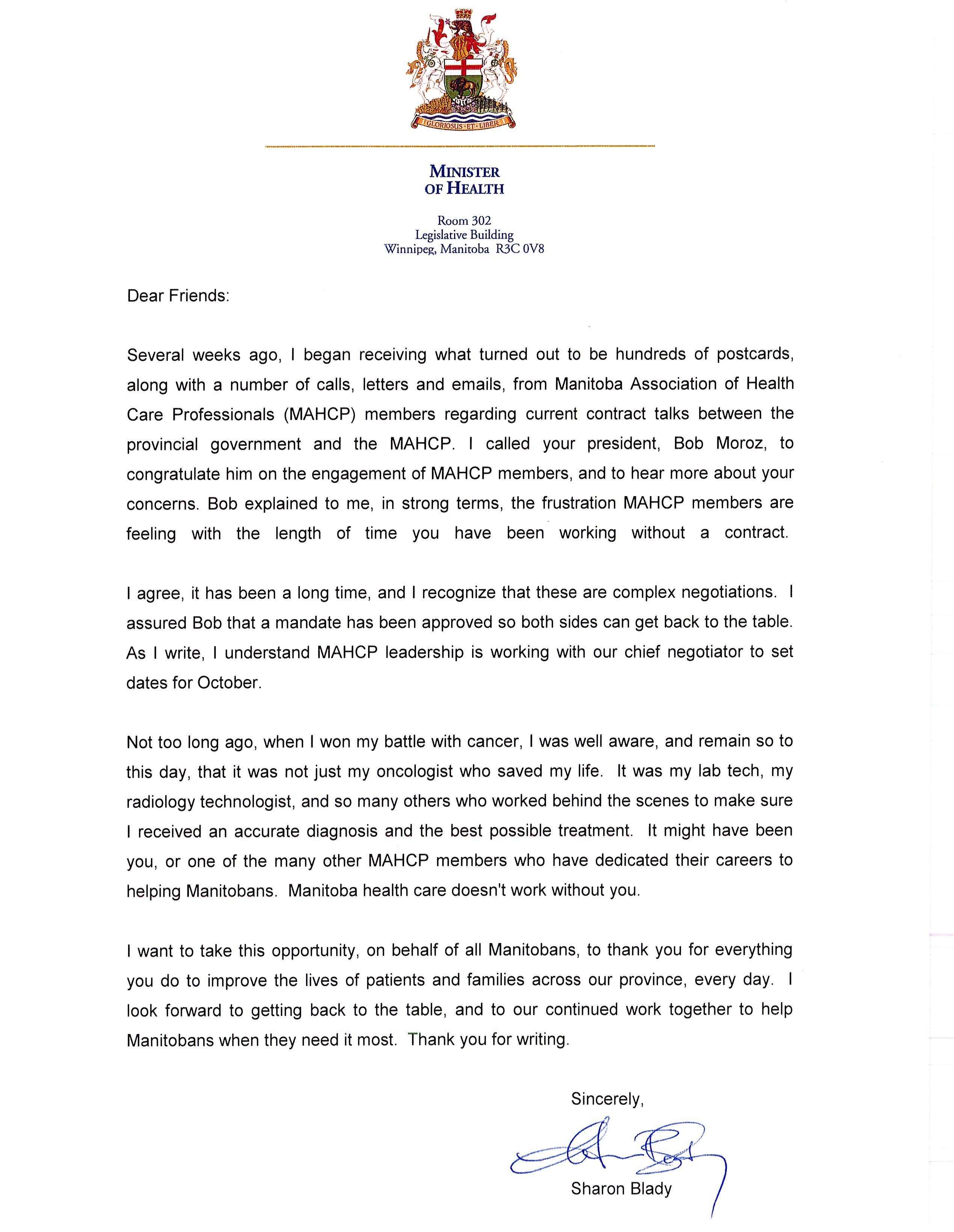 Below is an open letter I have received from the Honorable Sharon Blady, Minister of Health, Government of Manitoba. The key points that I have taken from this letter are contained in the second paragraph describing a mandate and the very last sentence of the third paragraph. I quote: “Manitoba health care doesn’t work without you.” This has been the message that we have been working so hard to deliver over the last number of years and it sure is gratifying to finally see that statement in writing.